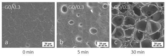 In summary, based on the ESEM, LM and LSCM observations, the swollen G0/0.3 hydrogel did not contain pores like those shown in Figure 1e,f. Clearly, these structures were secondary pores formed by crystallization of water in the gel and subsequent crystals sublimation under the chamber vacuum. Interestingly, the secondary cellular-like macropores in polyGMA gels were formed with great reproducibility always when water-swollen gels were treated by plunge-freezing and observed with cryo-SEM. We followed the development of secondary pores with observation time, see Figure 3. Initially, a patterned surface with just a few circular holes was seen (Figure 3a). The hexagonal pattern appeared within a frozen layer of water. After some time, more holes start forming in the hexagonal shape corners (Figure 3b). After some more time under the chamber conditions, more cavities appeared on the observed surface, and finally turned into cellular-like structures (Figure 3c). Similar effects of the prolonged exposure to the reduced pressure, and to the electron beam on the morphology of hydrogels have already been reported [14,15].