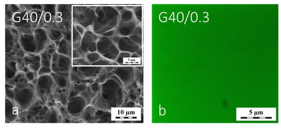 This difference in swelling well marks the difference of the macromolecular networks in G40/0.3 vs. G0/0.3 caused merely by network formation in the presence of various amounts of diluent. The G40/0.3 hydrogel was optically transparent in all states: as-prepared, equilibrium-swollen—expanded and dried at elevated temperature. The cryo-SEM images of the water-swollen G40/0.3 gel revealed porous cellular-like structure shown in Figure 4a. This structure is very similar to that of gel G0/0.3, cf. Figure 1e,f. In the sample G40/0.3, the porous structure revealed by cryo-SEM was attributed to the formation and sublimation of ice crystals following the plunge-freezing (in LN2). However, the observed morphology of G40/0.3 was somewhat different, revealing the number of small round-shape voids in the walls of cellular cavities. When the swollen gel G40/0.3 was chemically labeled by FITC and investigated by LSCM, there was no structure on the level of tens of micrometers seen, cf. Figure 4a vs. Figure 4b. The major difference between the G0/0.3 and G40/0.3 gels was thus their swollen macromolecular network topology resulting in a considerably different swelling degree and equilibrium modulus of elasticity, 250 kPa vs. 30 kPa (Table 1) respectively. The change of morphology of these hydrated gels when exposed to freezing conditions was qualitatively still similar, compare Figure 1e,f and Figure 4a,b.