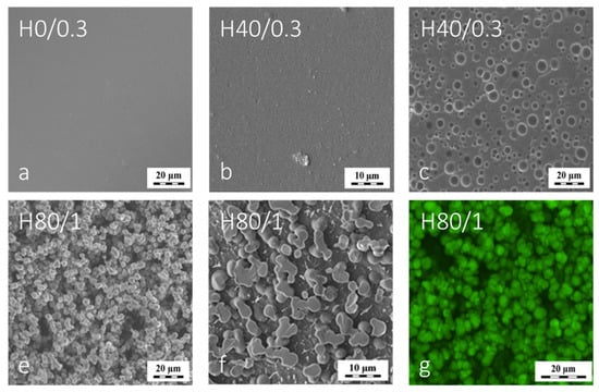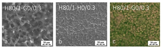 Covalently crosslinked macromolecular hydrogels based on poly(2-hydroxyethyl methacrylate), PHEMA, swell in water significantly less compared with the gels based on PGMA, cf. Table 1. For example, PHEMA hydrogel prepared without diluent absorbed 0.6 g of water per g of dry matter in equilibrium while EWC of G0/0.3 was 2.8. Although PHEMA is chemically rather similar to PGMA, its chains are less hydrophilic: they attain a special state of equilibrium conformation in water achieving balance between hydrophilic and hydrophobic interactions as described in [24]. We prepared PHEMA hydrogels in the absence as well as in the presence of a water diluent: sample H0/0.3 and sample H40/0.3. Both hydrogels as prepared and swollen to equilibrium volume in water were expectedly transparent. In their dry state, they revealed homogeneous morphology by ESEM, LM and cryo-SEM—similarly as for PGMA hydrogels (Figure 1a,b; the images for dry PHEMA not shown).