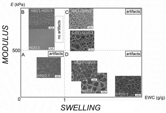 In the schematic map on Figure 7, the hydrogels were arranged according to their tensile modulus (E) as a mechanical parameter along the ordinate and their equilibrium water content along the abscissa. Four segments (A–D) in the map are related to the gels with relatively high or low values of E and EWC, which indicate the reliability borders of the plunge-freezing cryo-SEM method. According to these schematics, the cryo-SEM observation gave relevant results exclusively for the samples from segment B: those with low EWC and high E. When the EWC was too high (segments C and D), the formed ice crystals led to the appearance of secondary porosity irrespectively of the gel mechanical strength. When the tensile modulus of the gel was too low (segment A), the matrix could not withstand the formation of ice crystals even at relatively low swelling capacity.