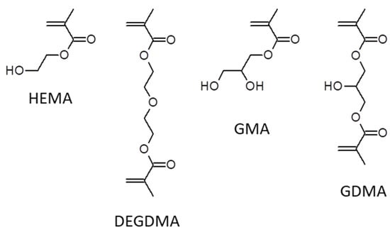 Structural formulas of the monomers and crosslinkers used for synthesis of hydrogels. HEMA, 2-hydroxyethyl methacrylate; DEGDMA, di(ethylene glycol) dimethacrylate; GMA, glycerol monomethacrylate and GDMA, glycerol dimethacrylate.