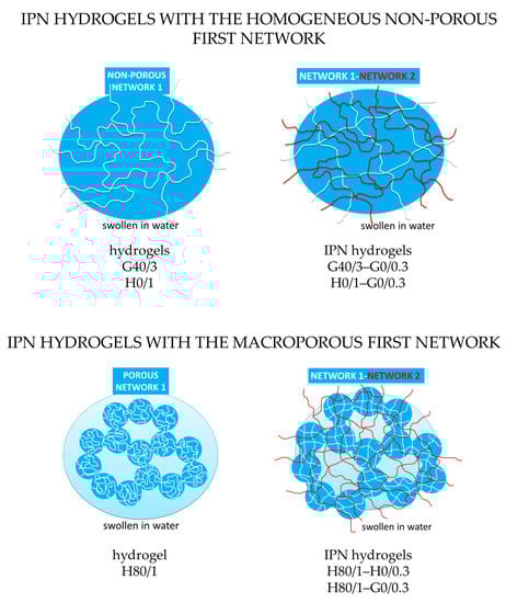 Distribution of the first and second macromolecular networks in interpenetrating network (IPN) hydrogels prepared by sequential polymerization presented schematically. The produced homogeneously interpenetrated networks based on G40/3 and H0/1 and microstructured IPNs based on H80/1.