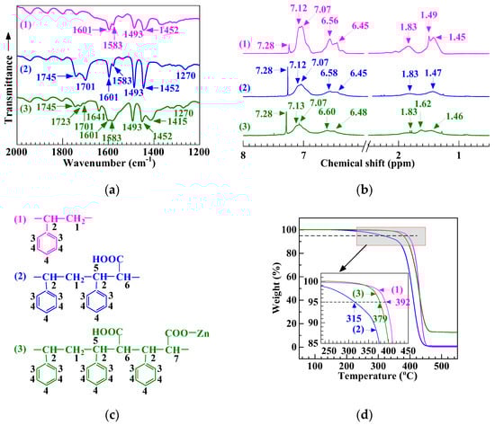 Likewise, the same PS, potential SCA, and SCA–Zn samples purified were used for 1H NMR spectroscopy (cf. Section 2.7) and TGA (cf. Section 2.8) to further verify their chain structures. Figure 1b shows the 1H NMR spectra of the potential (2) SCA and (3) SCA–Zn relative to (1) the PS. Numbered in Figure 1c are the supposed H atoms of the three resins, to which their 1H peak chemical shift (δ) values in Figure 1b were assigned as given in Table 3. Note that in Figure 1b(1)–(3), there were 1.49 and/or 7.28 ppm peak, respectively, of the residual H2O and/or CHCl3 in the chloroform-d solvent [36]. In Figure 1c(1) versus 1b(1) of the PS, the peaks of the H atoms of its CH2 (no. 1), aliphatic CH (no. 2), phenyl ortho-(no. 3), meta- and para- (no. 4) CH, respectively, appeared at δ values of 1.45, 1.83, 6.45 and 6.56, and 7.07 and 7.12 ppm [37]. Compared with the PS, the potential SCA in Figure 1c(2) versus 1b(2) did not exhibit any new peak(s) for its carboxyl hydrogens (no. 5) as well as their neighboring α-H atoms (no. 6), which presumably was due to the high activity of the carboxyl groups with respect to H atoms [38]. However, contrasted with the potential SCA, the presumable SCA–Zn demonstrated, for H-atoms no. 7, an additional new peak at 1.62 ppm (cf. Figure 1c(3) versus 1b(3)). This had to be owing to the Zn electrophilic substitution of part of the carboxyls at their H atoms during the neutralization, which deactivated some of the α-H atoms (no. 6) into those (no. 7) that displayed their peak at 1.62 ppm [39]. The full reconciliation of Figure 1b,c in Table 3, discussed above, verifies that the SCA–Zn synthetic trial was successful. Since the 1.62 ppm peak was pronounced enough in Figure 1b(3), the (effective) ion content, dictated by the degree of neutralization, of the potential SCA–Zn should be rather high, especially considering the 10.8 mol % of CA partly neutralized by the excess ZnO (2.5 times the stoichiometric amount).