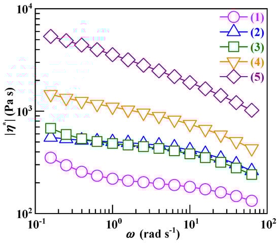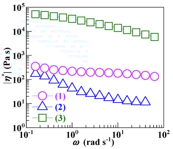 Figure 2 illustrates the complex viscosity magnitudes (|η*|’s) at 220 °C, during angular frequency (ω) sweep tests, of the (2) SCA and (3) SCA–Zn against those of (1) the PS. In the light of the Cox–Merz rule [41] shown below by Equation (4),