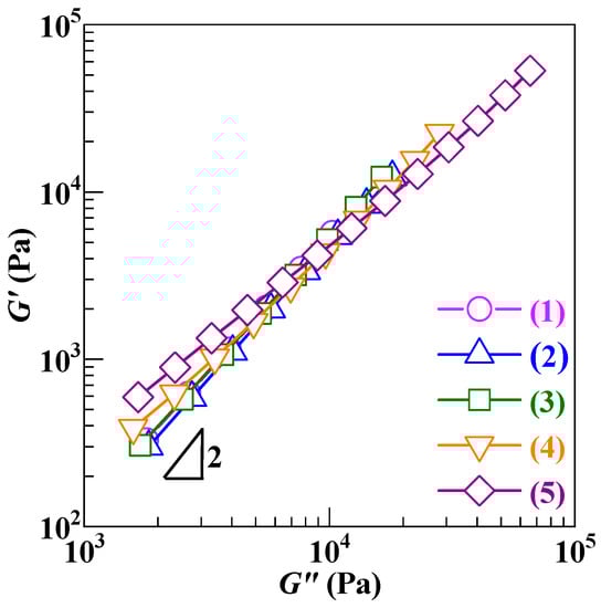 More quantitatively, the effect of the processability mismatch minimization was probed by a rheological oscillatory shear approach. Shown in Figure 4 are the Han (i.e., logG′ versus logG″) plots (Traces 2–5) of the PS/SCA–Zn blends against that (Trace 1) of the (neat) PS at 220 °C. It is observed that, similar to the PS (Trace 1), the Han plots of the 95/5 (Trace 2) and 90/10 (Trace 3) blends both demonstrated a slope of approximately 2 in the lower ω (i.e., lower left) terminal region, which was indicative of their almost homogeneous (i.e., single) phase morphology [42]. This discloses that instead of their apparent two-phase morphologies shown in Figure 3b,c respectively, both of the 95/5 and 90/10 blends actually were near miscible at 220 °C, which constitutes strong evidence that the PS–(SCA–Zn) processability mismatch indeed was minimized using the half critical SCA precursor. However, as the SCA–Zn content was raised further beyond 10 wt % more and more, the resulting 80/20 (Trace 4) and 60/40 (Trace 5) blends had Han-plot terminal slopes increasingly divergent from (i.e., smaller than) 2, revealing their gradually heterogeneous (i.e., two-phased) morphologies [43]. On the whole, with a monotonous rise in their SCA–Zn content, the miscibility of the blends progressively was reduced, which corresponds to the steady decrease in their interfacial compatibility apparently observed from Figure 3.