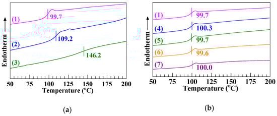 Figure 5b and Table 5(a,d–g), respectively, show the Tg and VST values of the PS/SCA–Zn melt blends ranging from 100/0 (i.e., the PS) to 60/40. It is found from Figure 5b that the four blends (Traces 4–7) all exhibited almost the same Tg as the PS (Trace 1), approximately 100 °C, which arose typically from the phase behavior nature of glass transition. In the near miscible (cf. Figure 4) 95/5 and 90/10 blends, the SCA–Zn chain-segmental ionic cross-links essentially were dissolved (i.e., destructed) by the major PS chains, making the minor SCA–Zn rigidification of the PS negligible (Traces 4 and 5, Figure 5b); even though the two blends were phase-separated near 100 °C (their near miscibility was observed from Figure 4 merely at 220 °C), a single Tg probably occurred for the PS matrix phase with the matrix Tg of the minor SCA–Zn phase indiscernible. Likewise, for the apparently two-phased (cf. Figure 4) 80/20 and 60/40 blends, there appeared only one Tg of the PS matrix phase despite the larger SCA–Zn fractions (Traces 6 and 7, Figure 5b), which was presumably due to the significantly weaker glass-transition step (Trace 3, Figure 5a) of the SCA–Zn’s matrix phase than that (Trace 1, Figure 5a) of the PS. Altogether, the two-phased PS/SCA–Zn blends (i.e., Traces 4–7 or 6 and 7, Figure 5b) invariably demonstrated a PS-matrix Tg little shifting from that of the neat PS (Trace 1, Figure 5b) toward a higher temperature, suggesting that their claimed acceptable interfacial compatibility at 220 °C (Figure 3) actually was not good enough at approximately 100 °C to give any convergence of the two components’ Tg values (99.7 and 146.2 °C).