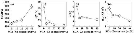 Effects of SCA–Zn content on the (a) Young’s modulus (E), (b) tensile strength (σ), (c) elongation at break (ε), and (d) Charpy notched impact strength (αcN) of the PS/SCA–Zn melt blends (including the neat PS), which are plotted using the data given in Table 6.