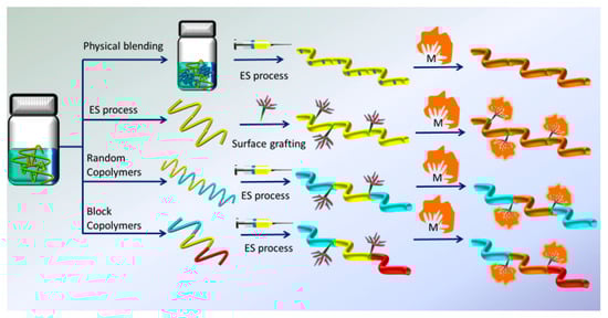 The removal of environmental toxicants has been made possible by numerous techniques such as distillation, floatation, hand picking, enzymatic degradation, ion exchange, coagulation, flocculation, precipitation, electrochemical methods, and so on. Electrospun nanofibers (ESNFs) have high demand in producing air and water filters, and they are being commercialized due to their production efficiency in creating diameter downsized continuous nanofibers [55]. Additionally, it offers good control in creating diverse morphological structures (including core-shell, hollow, porous, and nano nets), which are less time-consuming, easy to handle, and portable. These ESNFs also generate no waste and are easy to collect in 3D structures [37,55,56]. Such features have made adsorption enabled toxicant removal through ESNF a highly valuable due to their higher surface to volume ratios [12,57,58].