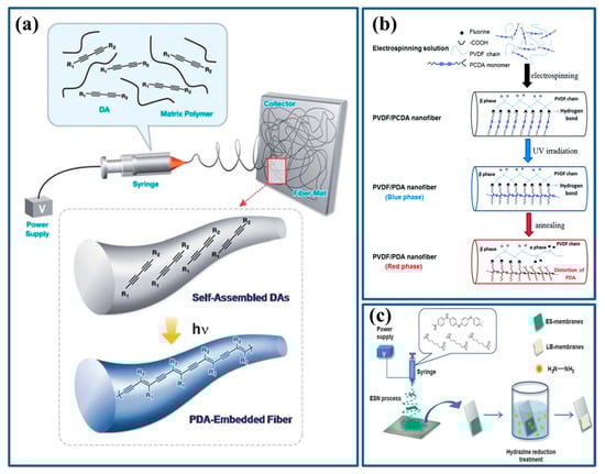 Recently, PDA embedded in ES polyvinylidene fluoride (PVDF) NFs has played a crucial role in generating dual colorimetric and piezoelectric responses (Figure 2b). PDA-incorporated NFs tend to possess a larger diameter and promote polar beta-phase growth. PVDF exhibits five crystalline conformations, among which trans conformation is highly demanded because of its piezoelectric properties. Achieving such promising conformations is made possible by facile ES technique with PDA; it additionally supports the optical sensory responses. The increment in beta phase is on the account of the polar carboxyl group of 10,12-pentacosadiynoic acid (PCDA), and the conformational presence can be analyzed through FTIR and wide-angle X-ray diffraction (WAXD). Under annealing conditions, the PCDA-conjugated backbone might disrupt the aligned molecular structures, ultimately leading to inferior beta phase. Blue phase enriched PDA ES nanofiber displayed greater sensitivity than red phase PDA because of the presence of higher beta-phase fractions [75].