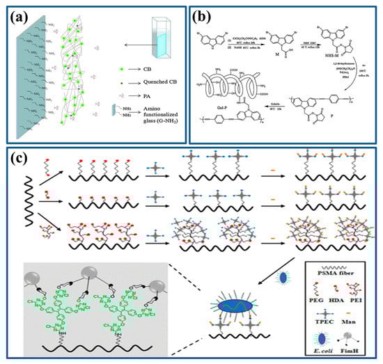 (a) 5-(N-carbazole styryl)-1,3-dimethyl-barbituricacid (CB)- polystyrene (PS)/ G-NH2 sensor fabrication in detecting picric acid. Reprinted from work in [3] with permission from Elsevier. (b) Mechanistic view of forming gel-P using synthesized polymer P grafted onto the gelatin. Adapted from work in [89] with permission from Elsevier. (c) Simple representation demonstrating the receptor grafting process takes place on the copolymeric Polystyrene-co-maleic anhydride (PSMA) nanofiber giving rise to the development of optical sensory fibers. Adapted from work in [90] with permission from American Chemical Society.