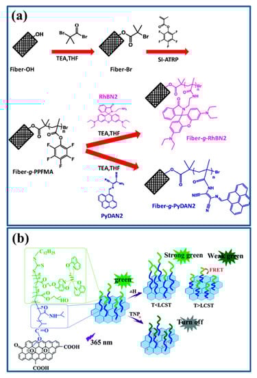 Smart polymers can respond to the different stimuli imposed on it and, depending on the stimulant, the sensory architectures and monitoring devices varies. Material science and polymeric technology during several decades raised several methodologies to design such stimuli responsive polymers. These smart polymers can respond to a variety of external stimuli, such as optical, solvent exchange, electrical, thermal, mechanical stress, ion factor, redox, pH, chemical, environmental, and biological signals [27,107]. (PNIPAAm-b-PNMA) block copolymer synthesized using ATRP followed by click reaction with alkynyl-terminated polyfluorene (PF) generated a triblock rod–coil–coil (PF-b-PNIPAAm-b-PNMA) structure which is electrospun to produce the thermoresponsive fibers (Figure 6a). The thermoresponsive fluorescent behavior is clearly demonstrated due to the predominant LCST behavior supported by shrinking and swelling of the polymeric chains causing distinct PL responsiveness [106].