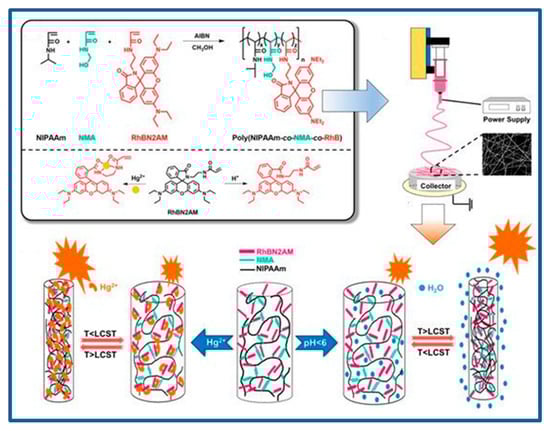 A novel fluorescent probe N-(2-(3,6′-bis(diethylamino)-3-oxospiro[isoindoline-1,9′-xanthen]-2-yl)ethyl)methacrylamide (RhBN2AM) was synthesized from rhodamine base and it was free-radical polymerized along with 2-hydroxyethyl methacrylate (HEMA) and N-methylolacrylamide (NMA) to form a random copolymer, poly(HEMA-co-NMA-co-RhBN2AM). The as designed sensory fiber with the optimized compositions tends to produce colorless to red transition in response to Hg2+ aqueous solution. PL response was improved further on decreasing the pH from 7 to 2 with favorable reversible sensing capability [114]. Subsequently, as a further advancement, the hydrophilic HEMA moiety of poly(HEMA-co-NMA-co-RhBN2AM) random copolymer was altered with amphiphilic NIPAAm moiety to impart thermoresponsive characteristics due to its room temperature LCST (Figure 5). The novel fluorophoric group RhBN2AM did not respond to pH and metal ion changes under basic and neutral conditions. The sensory fiber changed color on acidic media and changed selectively in the presence of Hg2+ because of ring-opened spirocyclic form [115].