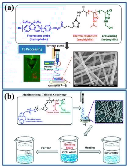 A short response sensory ES fibrous membrane fabricated with multi-arm copolymer prepared using ATRP. The copolymeric system and the chromophore are poly(isobutyl methacrylate)-co-poly(trifluoroethyl methacrylate)s (PolyIBMA-co-PolyTFEM)s and platinum porphyrin-based phosphorescence probes respectively. ES fibers displayed higher sensitivity as compared to sprayed films and shorter response time was harvested using high fluorine content because of its higher oxygen permeability [105]. Azide terminated diblock copolymer poly(N-isopropylacrylamide)-block-poly(N-methylolacrylamide) (PNIPAAm-b-PNMA) using ATRP and it is subjected to click reaction with alkynyl-terminated polyfluorene (PF) forming triblock rod–coil–coil (PF-b-PNIPAAm-b-PNMA) copolymer. Stearyl acrylate cross-linker was replaced with N-methylolacrylamide to form water stable ES fibrous membranes without causing any degradation to its fibrous morphology. The triblock copolymers prepared presents lower entanglements due to its lower molecular weights hence high molecular weight blending aids in producing stable ES fibers. Small-angle X-ray scattering (SAXS) and transmission electron microscopy (TEM) reveals the lamellar structure existence along the fiber axis. PNIPAAm blocks swell and light absorbed by polyfluorene (PF) fluorescent block creating a stronger fluorescent at high temperatures. The temperature responsive PL measurements remain reliable with very clean reversibility up to six cycles [106].
