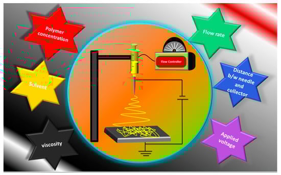 Electrospinning (ES) is a simple process to produce the continuous nanofibers by applying an electric voltage through the metallic syringe (Scheme 1). The applied electric field facilitates the formation of superfine nanofibers by overcoming the polymeric viscosities and getting deposited onto the collector substrate [37,38,39]. The conventional methods like drawing, template synthesis, phase separation, and self-assembly cannot produce continuous nanofibers with good morphological features. Numerous limiting factors with the abovementioned methods limited the production of nanofibers. ES technique finds many applications due to its synergistic control over the formation of continuous nanofibers with nanometer sized diameters with reduced hysteresis [40,41].