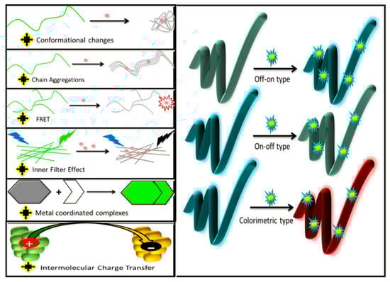 Optical sensors in general follow various sensing mechanisms such as conformational change, chain aggregation, Forster or fluorescence resonance energy transfer (FRET), inner filter effect (IFE), metal complex formation, or intermolecular charge transfer (ICT) to produce the various naked-eye optical responses, such as off–on, on–off, and colorimetric changes (Scheme 2).
