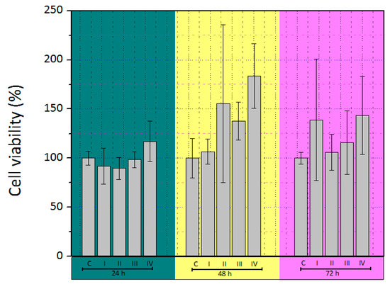The in vitro cytotoxicity of DM was evaluated using 3-(4,5-dimethylthiazol-2-yl)-2,5-diphenyltetrazoliumbromide (MTT) assay (Cell Biolabs Inc., Bogota, Colombia). Specimens of 10 mm in diameter were cut and placed at the bottom of a 24-well-plate (Corning, New York, NY, USA). Before the culture, samples underwent a sterilization process with ultraviolet light for 15 min each side. Then, cells were seeded on DM at a density 5 × 104 cells/well in the previous mentioned incubation conditions.
