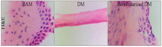 Microphotographs for BAM (left), DM (middle), and recellularized DM (right) obtained from the hematoxylin-eosin (H&E) assay (100×).