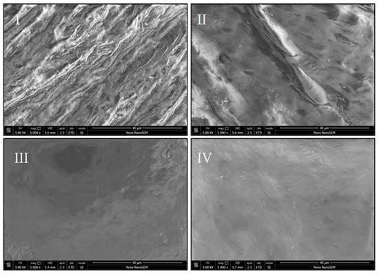 The micrographs of the studied membranes also confirm that the processes were efficacious for the elimination of the cells in all the tested protocols. There are differences in the surface of each membrane; for instance, image from protocol I depicts a surface where the collagen fibers are very similar to the native ones, whereas DM for protocol II is a smoother surface. DM obtained using protocol III showed tissue wear along with some crystalline residues and the sample of protocol IV is the most homogeneous of the appraised surfaces (Figure 7).