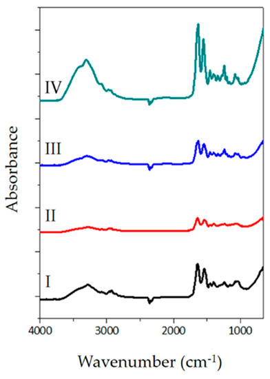 Attenuated total reflectance Fourier transform infrared (ATR-FTIR) spectra of the assessed samples are shown in Figure 8. The peptide characteristic bands at approximately 3300, 3000, 1630, 1545, 1240, and 690 cm−1 are identifiable. For example, the amide I is a broad band around 1640–1630 cm−1 originated from C=O stretching vibrations coupled to N–H bending vibration. The amide II band, which is located at around 1550 cm−1 arises from N–H bending vibrations coupled to C–N stretching vibrations. Finally, the amide III characteristics bands, that usually appear within the range of 1300–1200 cm−1 result from the interaction between N–H bending and C–N stretching. The band locate at 690 cm−1 is an usual amide vibration which emerges from out of plane N–H wagging [77,78,79,80].