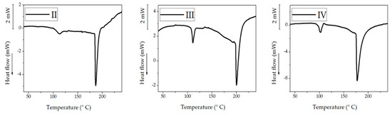 The thermograms of the decellularized membranes of protocols II, III, and IV are shown in Figure 9, and they correspond to the first heating scan. It was not possible to obtain the thermogram from the DM of protocol I because of the sample decomposition. Different endothermic denaturation peaks may be seen viz.: II, 185 °C; III, 200 °C; and IV, 152 °C. Collagen materials exposed to high temperatures endure irreversible denaturation process [81,82,83,84,85,86]. Previous thermo-analytical studies of denaturation of collagen report that the denaturation temperature for bovine skin is 55 °C [87], bovine intramuscular connective tissue 90 °C [88], rat tail collagen 65 °C [89], bovine skin 50–55 °C [84], and type I collagen from bovine skin soluble in acid 117 °C [90]. As the water content is higher, collagen denaturation temperature gets higher, and this phenomenon may be observed in this study. It should be noted that collagen denatures; therefore, there was no second heating scan; furthermore the treated samples also showed another endothermic peak (105–115 °C) which is most likely related to gelatinous structures by the denaturation that were obtained at day 21 of culture for protocols II and III [84].