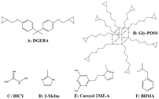 Structures of the precursors: (A) diglycidyl ether of bisphenol-A (DGEBA), (B) octaglycidyl-POSS (GlyPOSS), (C) dicyandiamide (DICY), (D) 2-methylimidazole (2-MeIm), (E) 2,4-diamino-6-[2’-methylimidazolyl-(1’)]-ethyl-s-triazine (Curezol) and (F) N,N-benzyl dimethylamine (BDMA).