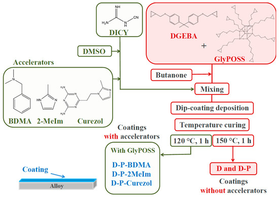 The preparation procedure of coatings is depicted in Figure 2. DGEBA (1.6 g) and GlyPOSS (0.4 g) were dissolved in butanone (2 g) and stirred for 30 min. For coating without GlyPOSS, only 2 g of DGEBA was dissolved in butanone (2 g). Separately, DICY (0.25 g) was dissolved in DMSO (1 g). Into the latter solution, if appropriate, one of three accelerators was introduced in molar ratio DICY:accelerator = 1:0.1. Both solutions were finally mixed. Before dip-coating deposition on aluminum alloy AA 2024 (Aviometal, Italy) with a pulling velocity of 10 cm/min, mixtures were left to stir 5 min. The substrates (dimensions: 2 × 5 cm2) were polished using 3 M Perfect-IT III paste and subsequently sonicated in hexane, acetone, and methanol for 15 min. Specifically, for this research five types of coatings were prepared: