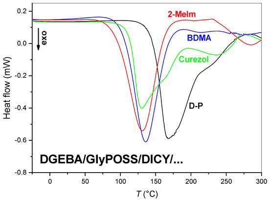 The processes that are described for the D formulation also occurred in other investigated systems but at a different temperature-scale (Figure 8). In D-P formulation, the crosslinking happened already after 62 min and the temperature of 146 °C (Table 2). Other characteristics of the curing processes remained similar as for D formulation. However, the absolute value of elastic modulus G′ reached higher values for the formulation with GlyPOSS compared to neat D formulation. This indicated that more crosslinked and stiff structure formed when GlyPOSS with eight glycidoxy groups steaming from the siloxane cube center was added.