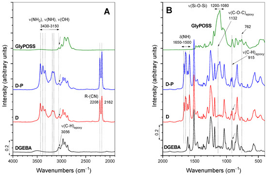FT-IR absorbance spectra of precursors DGEBA and GlyPOSS, and initial D and D-P formulations in the spectral ranges: (A) 4000–1900 cm−1 and (B) 2000–400 cm−1.