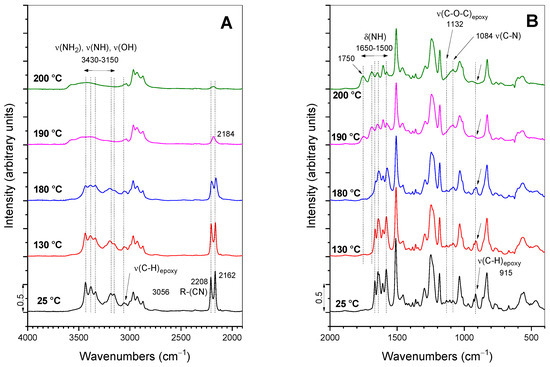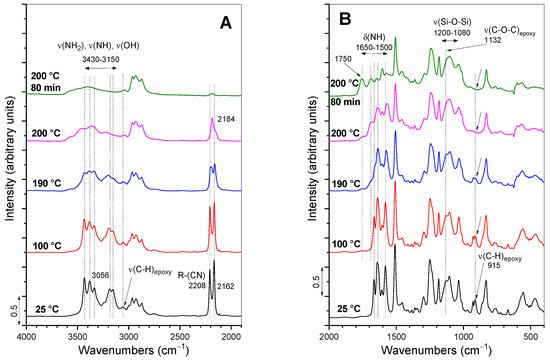 The same trend, i.e., decrease in the intensity during curing (Figure 5), was observed for the bands associated with amines of DICY in the spectral region 3430–3150 cm−1 (ν(NH2), ν(NH)) and 1650–1500 cm−1 (δ(NH)). According to the literature, cyano–CN groups (2208 and 2162 cm−1) can also provide crosslinking at higher temperatures [31]. Such network crosslinking in the formulation is evident from the appearance of the stretching ν(C–N) band at 1084 cm−1 at temperatures around 190 °C. Since this band is overlapped by ν(Si–O–Si) bands of silsesquioxane GlyPOSS in Figure 5, its evolution can only be followed in the spectra of D formulation (Figure 6; Figure S3 in Supporting Information). The curing process of D-P formulation was finished after 80 min at 200 °C (Figure 5). The main characteristics of the FT-IR bands with curing were similar, in the case of D formulation (Figure 6). The spectra revealed the decrease in intensity of epoxy, amino and cyano bands at 200 °C. As mentioned above, due to the absence of ν(Si–O–Si) bands, the increase in the intensity of stretching ν(C–N) band can be observed (Figure 6B).