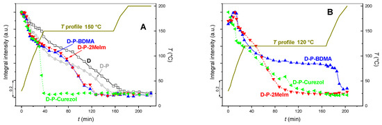 The addition of accelerators to D-P formulation changed the course of the integral intensity curves (Figure 7A). During the temperature increase up to 150 °C, the integral intensity of the 915 cm−1 band decreased quicker compared to that of the neat D-P formulation. Interestingly, the accelerators BDMA and 2-MeIm behaved similarly. Such behavior was expected since at this temperature these two accelerators are characterized as compounds that catalyze the opening of glycidoxy rings [32]. When accelerator Curezol was added, the integral intensity decreased abruptly after reaching 130–140 °C (after 30–40 min in Figure 7A). This is understandable since the Curezol—in addition to the opening of the glycidoxy rings—can also contribute to the crosslinking reactions (post-curing) through primary amino groups at the triazine ring (Figure 1E).