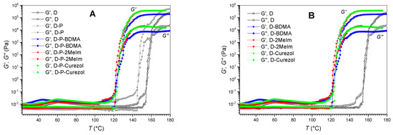 Rheological characterization formulations during thermal curing: (A) D-P-based and (B) D-based formulations.