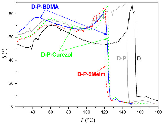 Specifically, the phase angle δ shows the time delay between the determined sinusoidal parameters and the measured characteristics G′ and G″. These differences occur due to the viscosity changes of the measured formulations. The values of phase angle are 45° to 90° for liquids, at δ = 45° crosslinking occurs, while below 45° to 0° G′ dominates over G″ indicating formation of solid materials. An ideal elastic deformation would result in δ = 0°, an ideal viscous deformation in δ = 90°. These characteristics can also be viewed from Figure 9. Namely, in the beginning, when formulations are in a liquid state, but their viscosity increase, the values of phase angle are between 90° and 45°. When crosslinking occurs for G′ = G″, the phase angle equals 45°. Then the decrease in the values of the phase angle towards 0° indicates the solid-state of the measured material. In this range, the epoxy formulations become highly crosslinked, molecules with larger and larger molar mass form, and their mobility is significantly decreased. The rigidity of the material increase, but during all stiffening processes also some reactive components may be present.