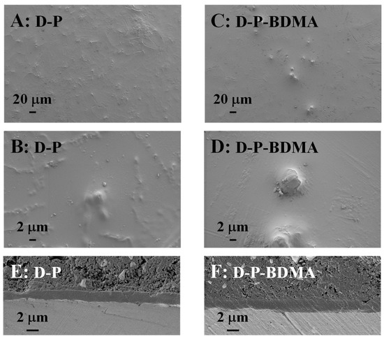 SEM micrographs of protective coatings at different magnifications: (A,B) D-P coating and (C,D) D-P-BDMA coatings. (E,F) Cross-cut SEM micrographs of D-P (E) and D-P-BDMA (F) coatings.