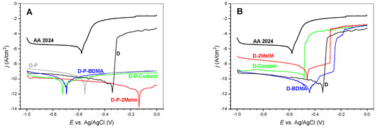 Potentiodynamic polarization curves of protective coatings; (A) D-P-based formulations and (B) D-based formulations.