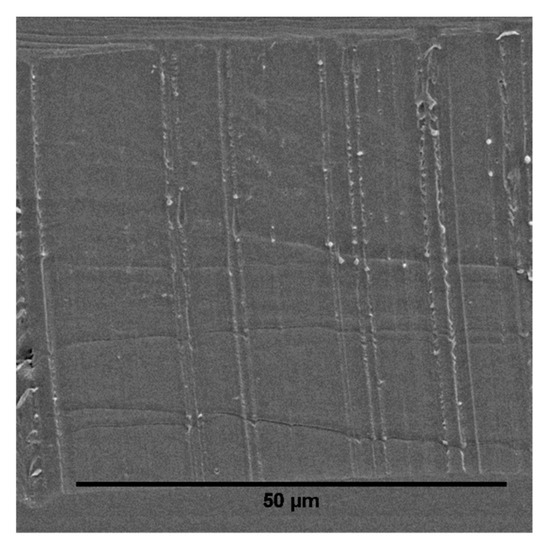 For a more detailed analysis of the phase morphology of the prepared blends, we performed SEM measurements of sliced sample surfaces, which are depicted in Figure 5, Figure 6 and Figure 7. Cryo-slicing of the pure PLA shows cutting grooves, but no second phase. On the other pictures, it is possible to differentiate between those grooves and the elastomeric soft phase when analyzing the samples regarding the size and distribution of the soft phase. We can see qualitatively in Figure 6 and Figure 7 that the addition of TBEC alone did not contribute to the size reduction of the EPDM particles. Only the addition of EMAGMA as a compatibilizer reduces the particle size of the soft phase significantly. This is in accordance to the mechanism of droplet breakup considering Equation (9). The combination of EMAGMA and TBEC does not have an additional effect on the size of the soft phase.