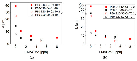 In addition to the physical compatibilization effects of EMAGMA, it contains epoxy groups that can react with hydroxyl or carboxyl groups of the PLA [42,43]. These reactions would lead to copolymers of PLA and EMAGMA, which would have a higher compatibilizing effect than the pure EMAGMA. This is illustrated in Figure 1.