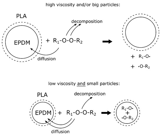 Proposed mechanism for peroxide diffusion and decomposition in the PLA–EPDM blends investigated.