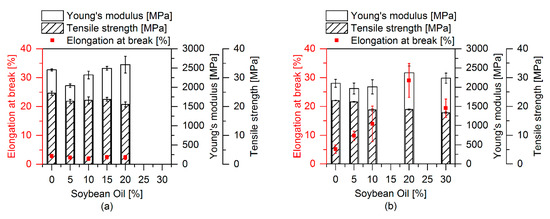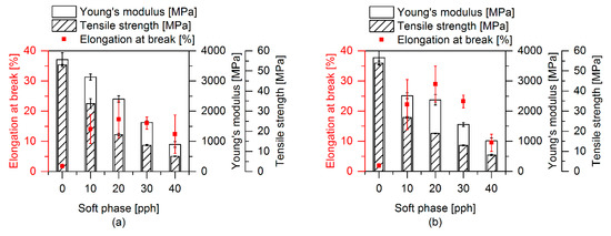 Tensile properties with varying contents of SBO inside the soft phase. Each sample contains 20 pph of soft phase. (a) Samples without EMAGMA and TBEC and (b) samples containing 5 pph EMAGMA and 0.2 pph TBEC.