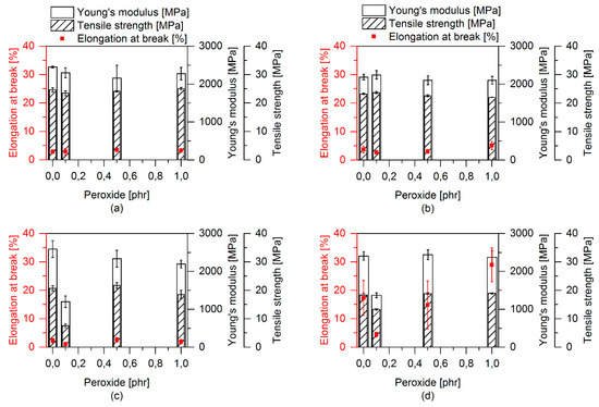 The influence of the content of EMAGMA is depicted in Figure 13. The blends without SBO and TBEC show a slight increase in elongation at break, but no significant change in the other tensile properties. When adding SBO to the blends, the tensile strength decreases from about 25 MPa without SBO to 20 MPa and the Young’s modulus does not change considerably. The addition of EMAGMA leads to a substantial increase in elongation at break from about 2% to nearly 20%. When adding both, SBO and TBEC, to the blend, the increase in elongation at break is even more impressive and reaches values of more than 30%, which is 15-fold higher than for PLA and the pure blend of PLA and EPDM. These results clearly indicate the interrelationship of all the additives and thus corroborate the proposed mechanism of peroxide diffusion and decomposition. On the other hand, our results also show that small particle sizes and inter particle distances alone are not sufficient to increase the mechanical properties of PLA–EPDM blends. The materials without SBO and TBEC also comprise of small EPDM particle sizes and inter particle distances. However, only the combination of EMAGMA, SBO, and TBEC leads to an enhancement of the mechanical properties, especially regarding the elongation at break. This indicates that interfacial adhesion together with the properties of the different polymeric phases of the TPVs plays a crucial role for their mechanical properties.
