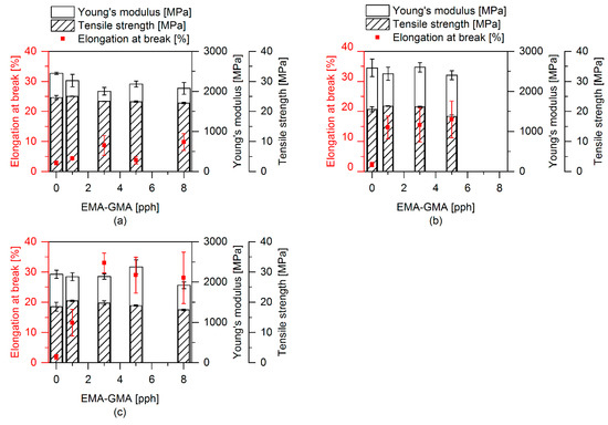 Tensile properties with varying ratios of EMAGMA. Each sample contains 20 pph of soft phase. (a) Samples without SBO and TBEC, (b) samples with 20 wt % SBO inside the soft phase, and (c) samples with 20 wt % SBO inside the soft phase and 0.2 pph TBEC.