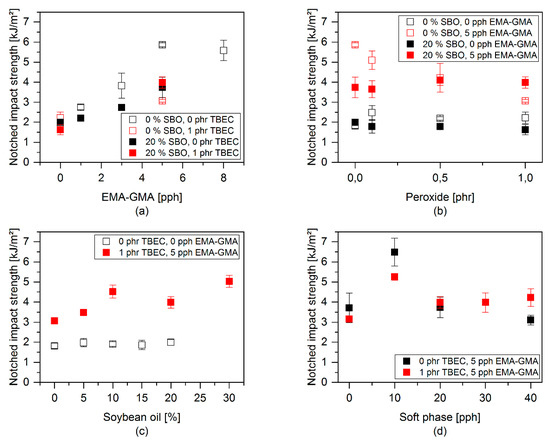 Notched impact properties with variation of different components: (a) Variation of EMAGMA content, (b) variation of TBEC content, (c) variation of SBO content, and (d) variation of soft phase content.