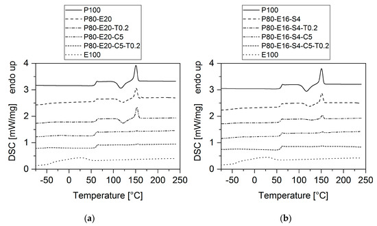 Second heating run of the differential scanning calorimetry (DSC) measurements of the corresponding samples. (a) Samples without SBO and (b) samples with SBO. The curves have been shifted for better comparability.