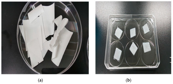 Crosslinking was performed to control the drug release from the alginate/CMC/PEO nanofiber film through the control of the mechanical properties, and CaCl2 was selected as the crosslinking agent. For the crosslinking of the alginate/CMC/PEO nanofiber film, CaCl2 was completely dissolved in 95% ethanol using a stirrer. The concentrations of the crosslinking agent solutions used in this study are shown in Table 2. Before crosslinking, the electrospun film was prepared by cutting it into 1 cm × 1 cm pieces (Figure 1). Then, the cut films were placed one by one in a 6-well plate. The crosslinking reaction was carried out with the electrospun films for 30 min. Then, to remove the remaining solution, the films were washed with 95% ethanol and dried at room temperature for 30 min.