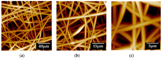 Morphological and surface characterization of the 9% (w/v) alginate/CMC/PEO nanofiber film. Analyses used the noncontact mode of atomic microscopy. (a–c) are the same films at different scales (scale bars 40 µm, 15 µm, and 5 µm).