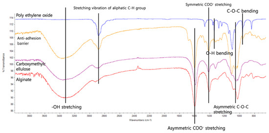 FT-IR analysis data on the alginate/CMC/PEO film (anti-adhesion barrier).