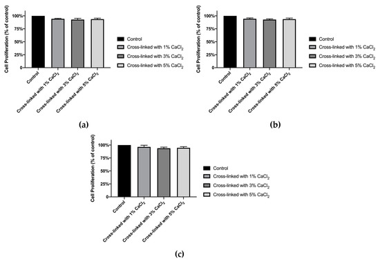 The cytotoxicity test was performed using a microplate reader (optical density (OD): 450 nm). (a) graph obtained from 5% (w/v) alginate/CMC/PEO nanofiber film. (b) graph obtained from 7% (w/v) alginate/CMC/PEO nanofiber film. (c) graph obtained from 9% (w/v) alginate/CMC/PEO nanofiber film.