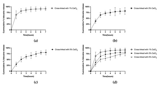 Evaluation of the lidocaine release behavior of 9% (w/v) alginate/CMC/PEO nanofiber films by crosslinking degree. All data were obtained from HPLC. (a) is the release behavior of the crosslinked alginate/CMC/PEO nanofiber film with 1% (w/v) CaCl2. (b,c) show the release behavior of the crosslinked alginate/CMC/PEO nanofiber films with 3% and 5% (w/v) CaCl2. (d) is a comparative analysis of the HPLC data in (a–c).