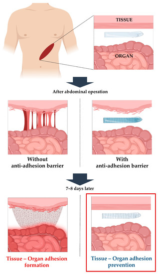 Most abdominal operations cause unnecessary tissue adhesion during the tissue healing process [1], which can lead to various complications [2]. Various formulations of film or gel anti-adhesion agents are used to prevent tissue adhesion after abdominal operations [3]. The medical products normally used include Seprefilm®, Interceed, and Guardix-sol. Studies have demonstrated reduced tissue adhesion formation in animal models and in clinical reports [4,5,6]. Scheme 1 shows the process of postsurgical tissue/organ adhesion and the role of the anti-adhesion barrier.