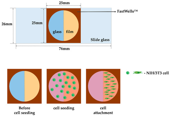 The cytotoxicity and proliferation of the electrospun films were evaluated using a LIVE/DEAD Viability/Cytotoxicity Kit for Mammalian Cells and a WST-8 Kit. To confirm the cytotoxicity of the films, NIH/3T3 cells were cultured on slide glass and placed in FastWellsTM reagent barriers with an electrospun film (Scheme 2). The culture environment was designed to evaluate the cell adhesion and cytotoxicity of the electrospun film. NIH/3T3 cells were seeded at 3 × 105 cell density with FastWellsTM reagent barriers. Cytotoxicity was qualitatively evaluated by fluorescence analysis using a confocal microscope (K1-Fluo; Nanoscope Systems, Daejeon, South Korea). The proliferation evaluation of the films was performed in 96-well plates. NIH/3T3 cells were seeded at 2 × 105 cell density per well. The sample was cultivated in a cell incubator for one day, and then the electrospun film was cut into 0.5 cm × 0.5 cm pieces and put into each well. After 6 h, the cell medium was removed, and 150 µL of fresh basal medium and 50 µL of WST-8 reagent were added and reacted for one day. Data on the proliferation evaluation were obtained from an absorbance analysis on the microplate reader (Synergy H1; BioTek, Winooski, VT, USA). The absorbance measurement value was performed at optical density (OD) 450 nm.