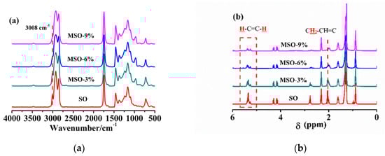 The remaining quantity of double bonds of the MSO with different sulfur amounts were determined by FTIR (Figure 1a) and 1H-NMR (Figure 1b) testing. From the FTIR spectra, the peak at 3008 cm−1 represents C=C–H bending vibration of double bonds, and the peak intensity decreased with increasing quantity of sulfur. That is to say, the double bonds of SO were reacted/consumed by sulfur.
